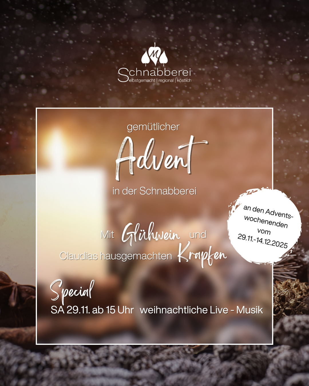 - ABGESAGT! 29. & 30. November | Weihnachtszauber | STATTDESSEN: Gemütlichkeit im Café mit weihnachtlicher Live-Musik am Samstag, 29.11., ab 15 Uhr